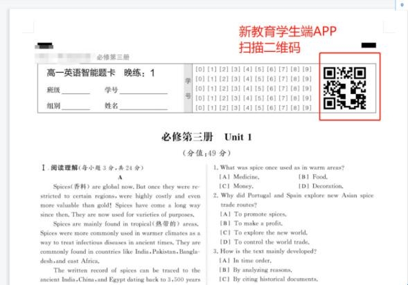 2、学生登录账号后,点击首页【作业】左上角的扫描按钮。扫描题卡上的二维码,客观题可以直在手机APP上作答,主观题需要在纸上作答后,拍照上传。