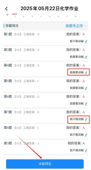【提交】后,先看到各题的答题正误情况,学生可以根据自己对这道题的掌握情况选择是否需要讲解;