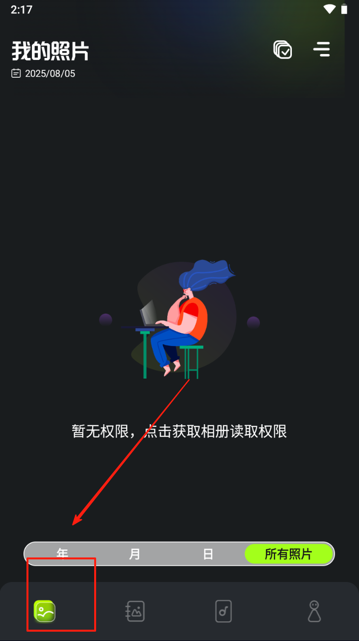 1、点击“年”按钮获取相册读取权限,查看和管理您的照片。