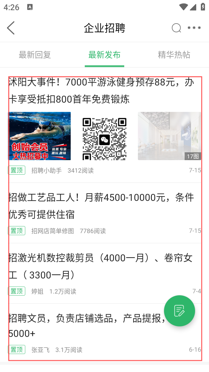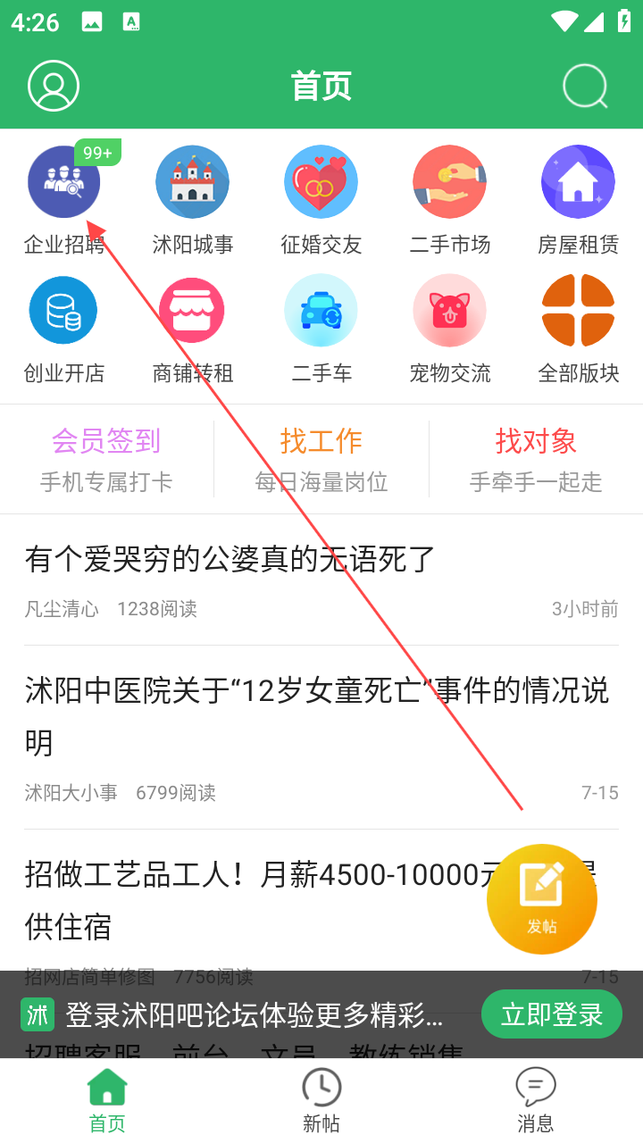 1、打开应用进入沭阳吧论坛首页,找工作点【企业招聘】板块,进入查看岗位。