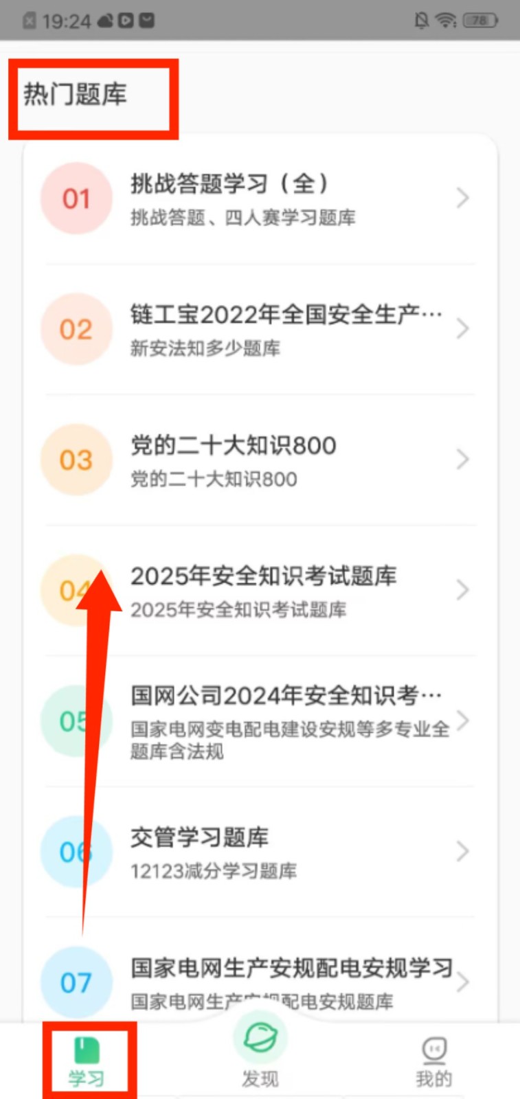 2、在学习页面的 “热门题库” 板块,可直接选择推荐的题库,进入对应内容开始练习答题。