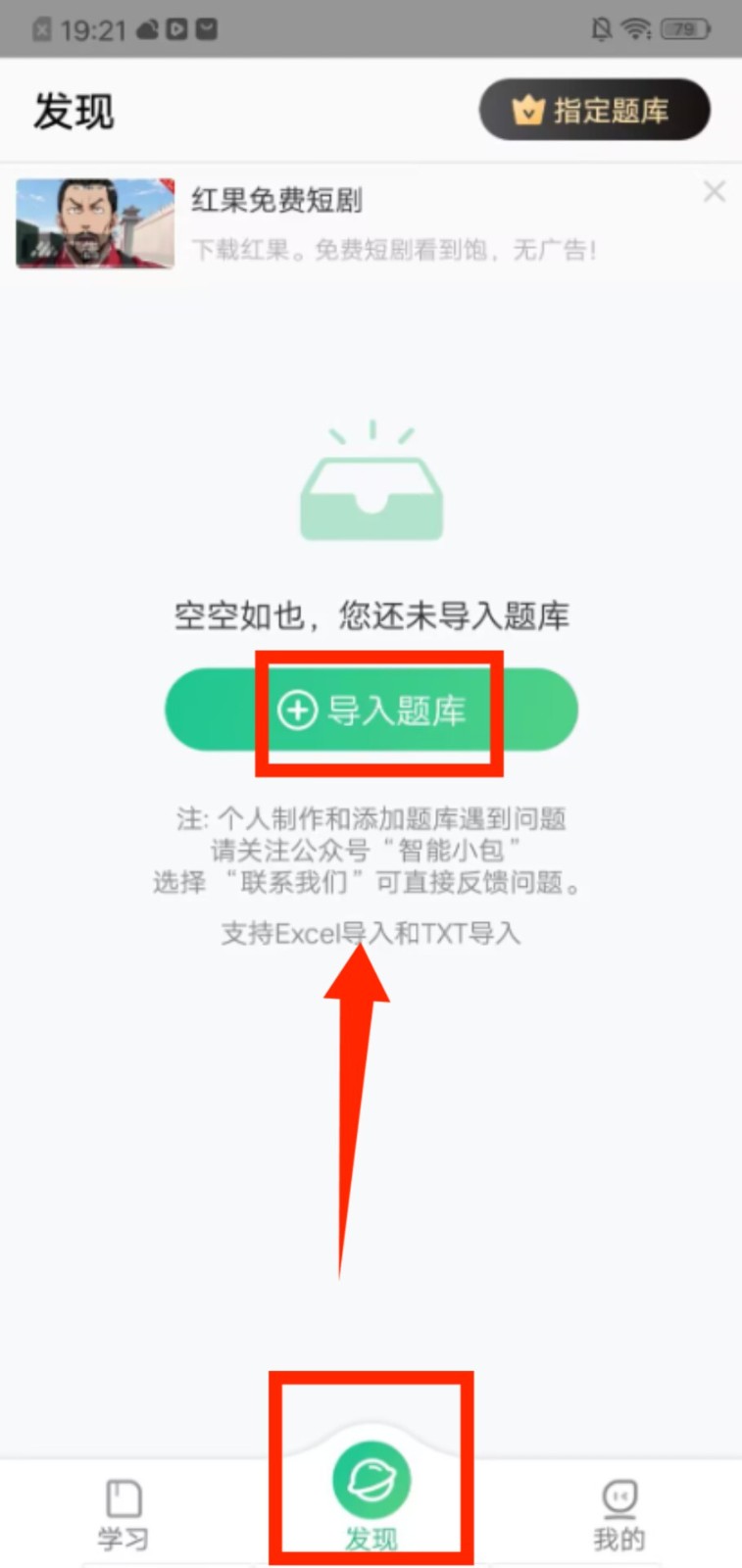 3、切换到发现页面,点击 “导入题库” 按钮,可通过 Excel 或 TXT 格式导入个人整理的题目资源。