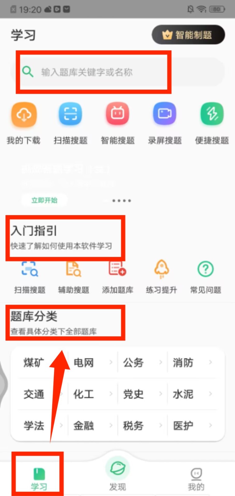 1、进入学习页面,点击顶部搜索框输入内容查找题库,也能通过 “题库分类” 选择对应领域的练习内容。