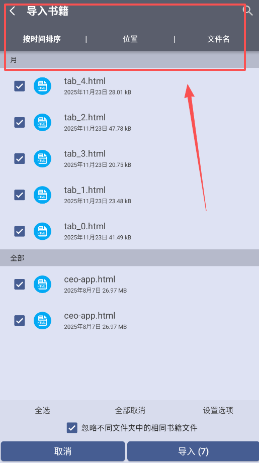 2、添加书籍的操作十分简便,在导入界面勾选你想要阅读的文件即可;若文件数量较多,使用全选功能会更便捷,最后点击导入按钮,这些书籍就会显示在你的书架中。
