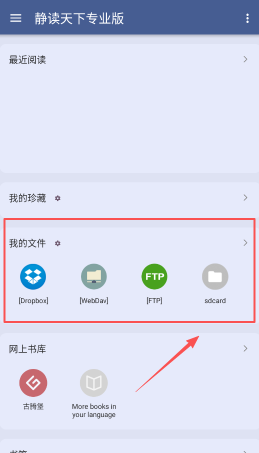1、开启阅读之旅的方式很简单:你可以通过主界面的“我的文件”入口,找到存储在手机本地或云盘中的书籍;也能浏览网上书店,直接获取古腾堡等平台提供的免费优质书籍。