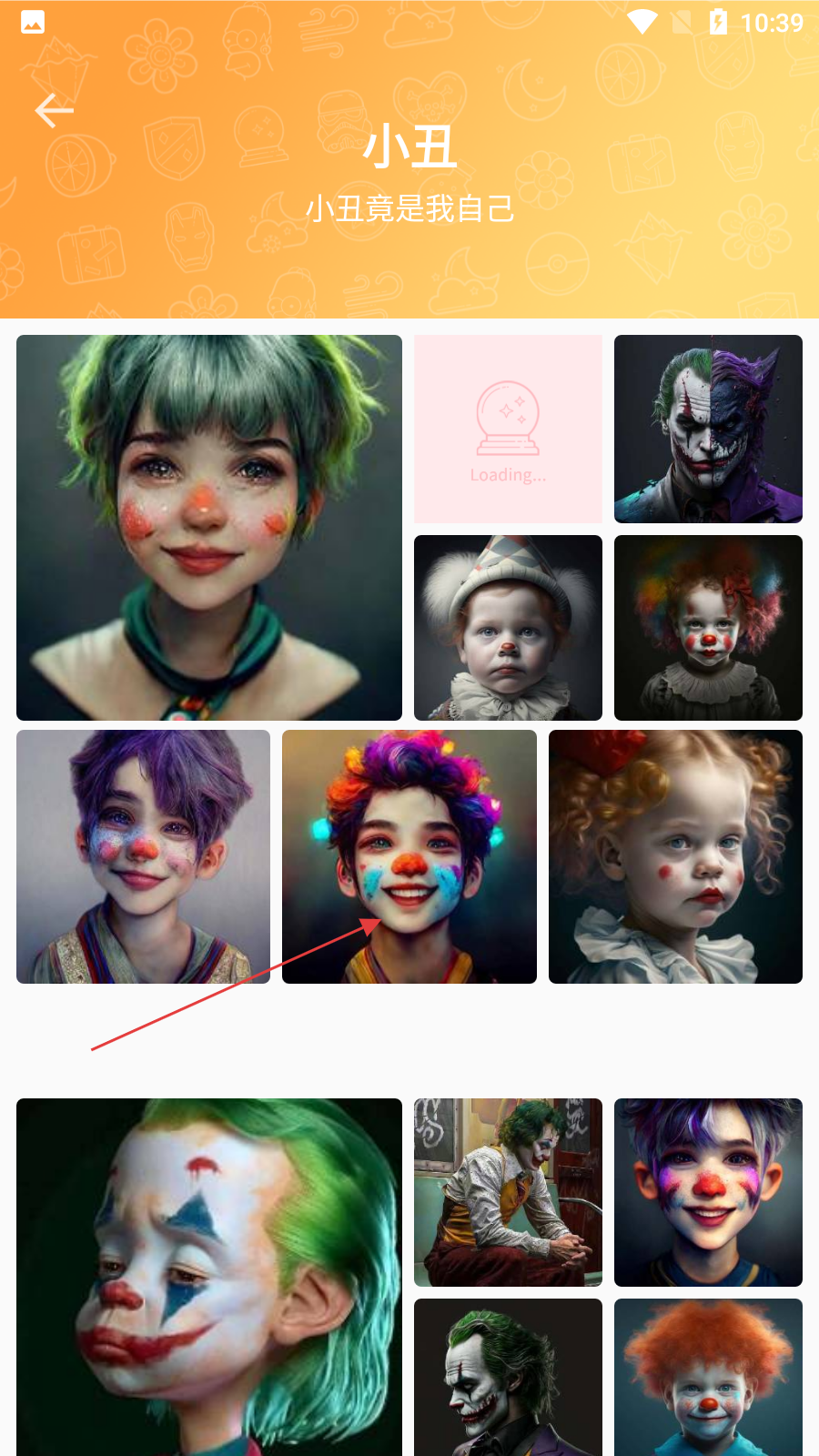 2、在小丑主题页,浏览不同样式的小丑图片,点击喜欢的进入预览界面。