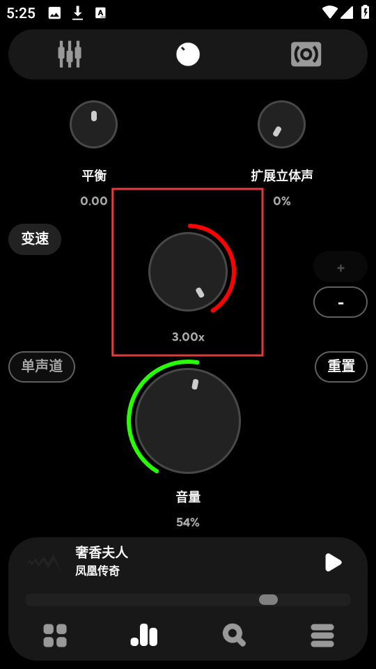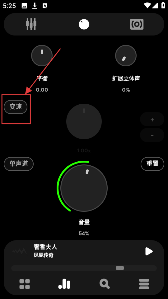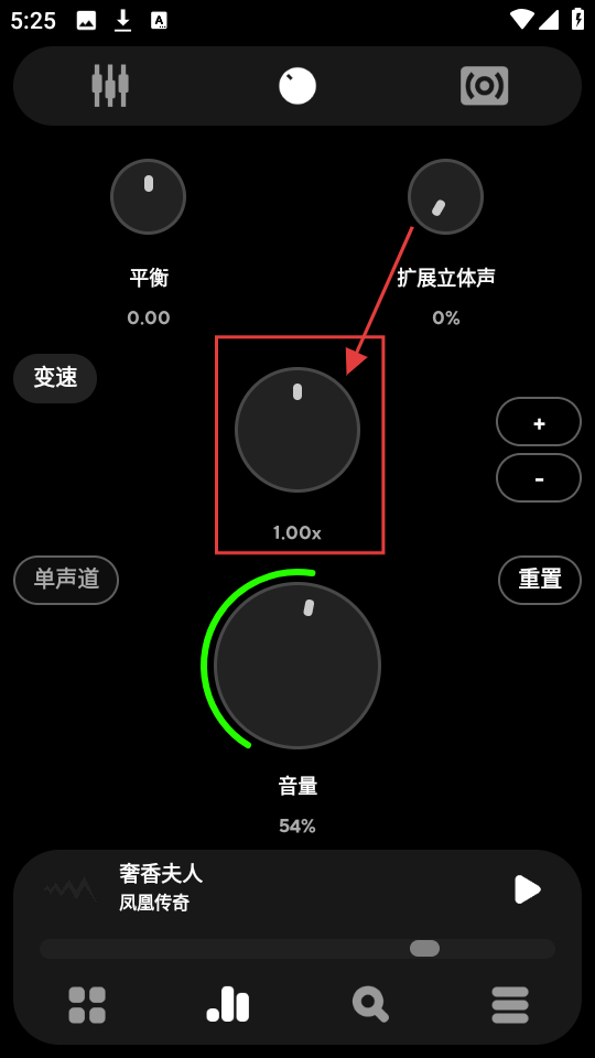 3、进入变速调节界面后,我们可以看到速度调节旋钮,通过转动它来调整音频播放速度。