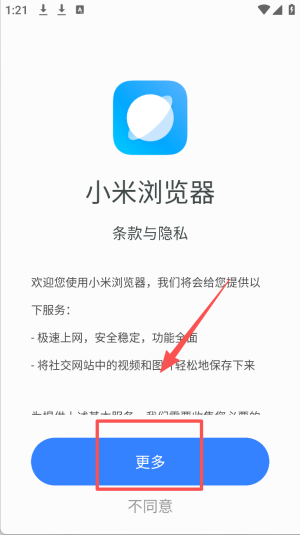 2、点击“更多”按钮,查看小米浏览器的条款与隐私。