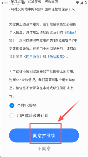 3、点击“同意并继续”按钮,同意条款并开始使用。