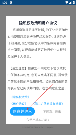 1、打开应用查看协议点击同意并进入。