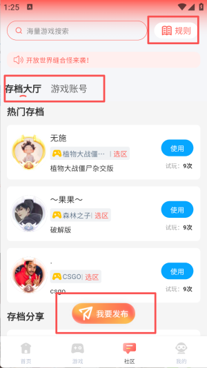 3、进入社区板块,可查看存档大厅的游戏账号存档,点击我要发布分享个人游戏存档,还能参与游戏攻略交流。