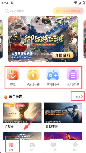 1、进入飞鸽云游戏首页,可搜索海量游戏,参与签到领取免费时长,浏览热门推荐游戏,从首页开启游戏探索之旅。