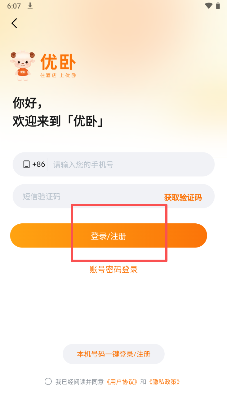 4、登录或注册账号:在登录页面输入手机号,点击“登录/注册”进入个人账户。