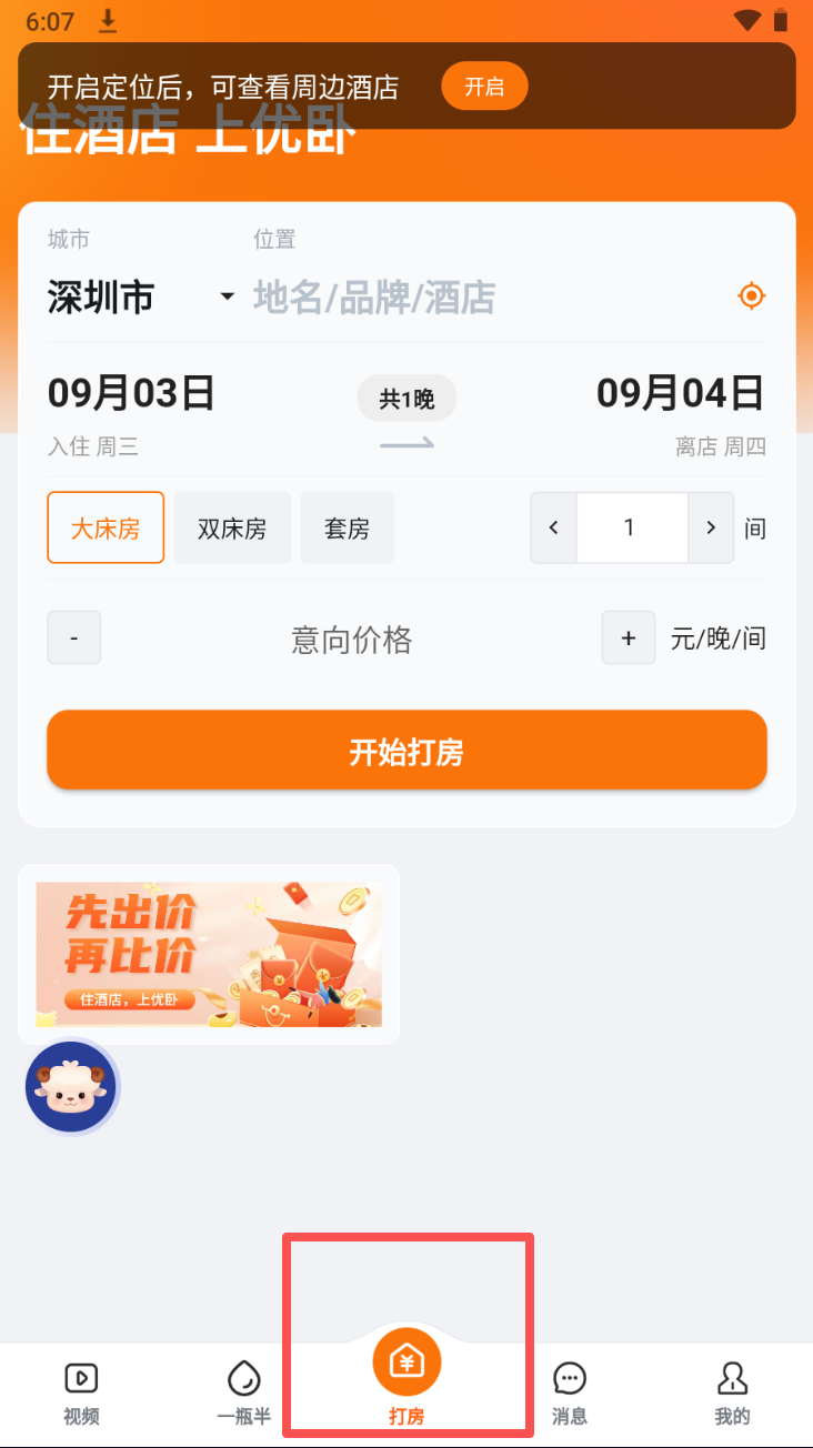 2、选择酒店预订:在首页选择城市和日期,点击“开始订房”进行酒店预订。