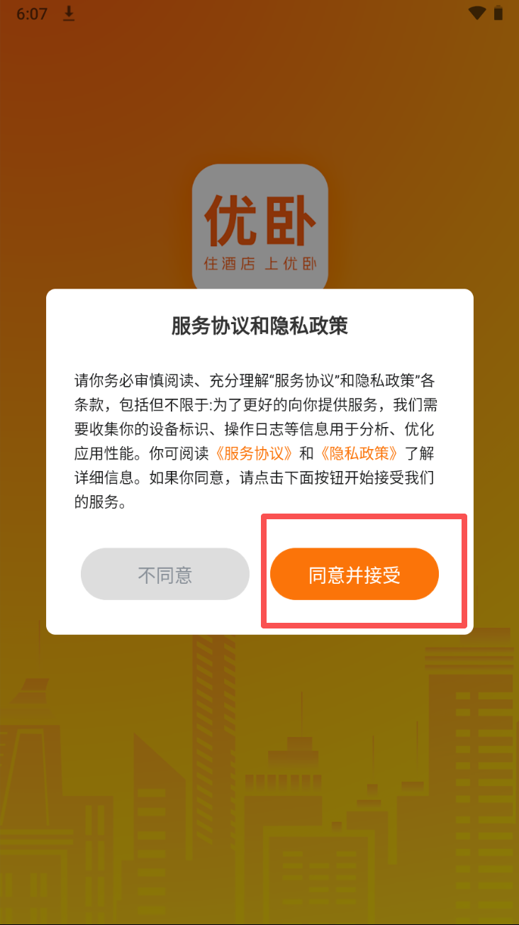 1、同意服务协议:阅读并同意“服务协议”和“隐私政策”,点击“同意并接受”继续。