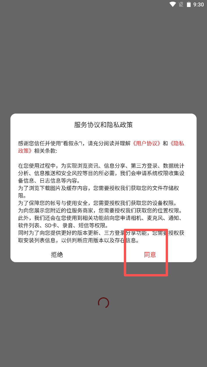1、阅读并同意服务协议和隐私政策,点击“同意”按钮。