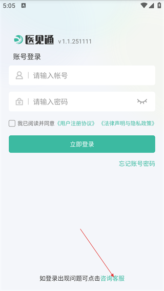 1、首次打开“医见通助手”APP,阅读温馨提示中的隐私政策及服务说明后,点击“同意”按钮,进入账号登录页面。