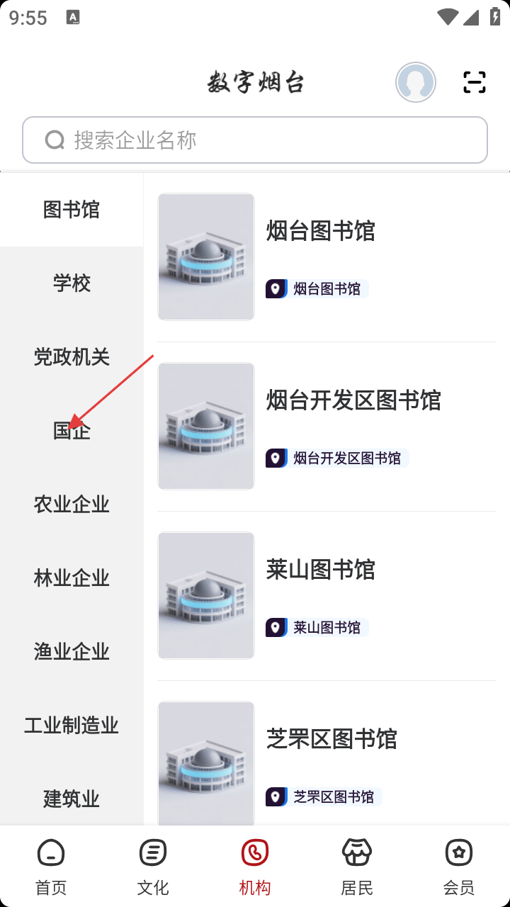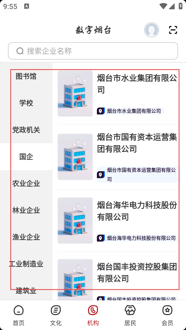 2、在【机构】页选【国企】分类,查看烟台国企列表。