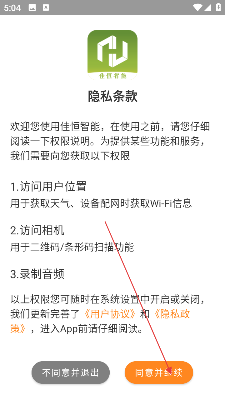 1、打开应用在【隐私条款】页,阅读权限说明后,点击【同意并继续】。