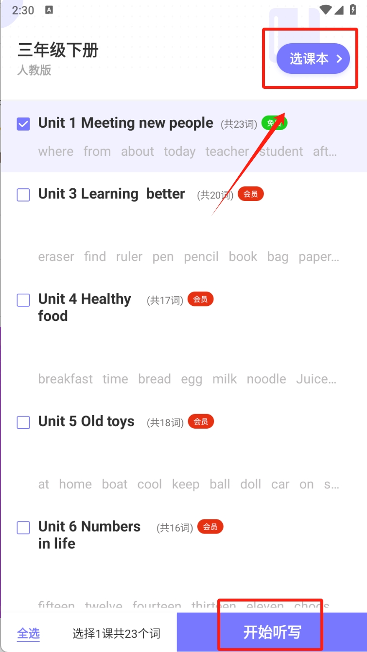 2、选择课程单元开始听写,在课程页面,点击“选课本”按钮,选择需要听写的单元。