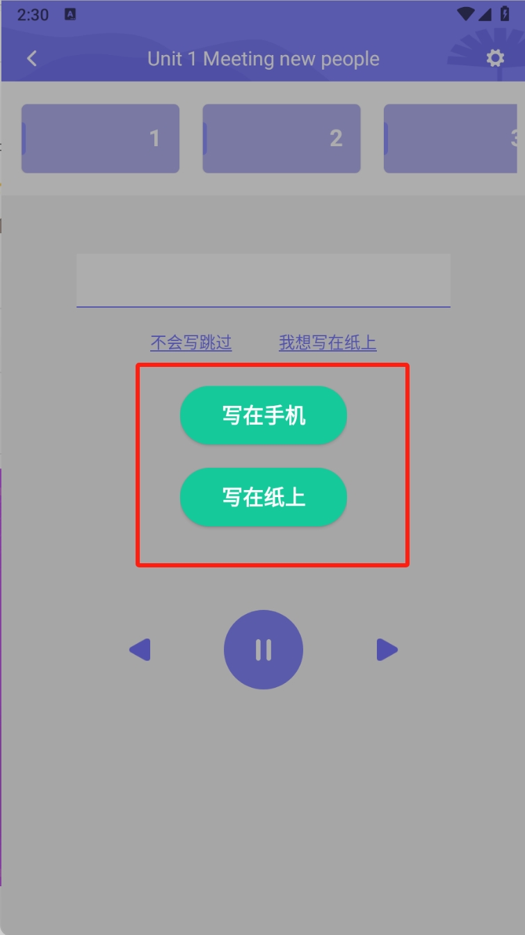 3、进行听写练习并选择练习方式,在听写页面,点击“写在手机”或“写在纸上”进行练习。