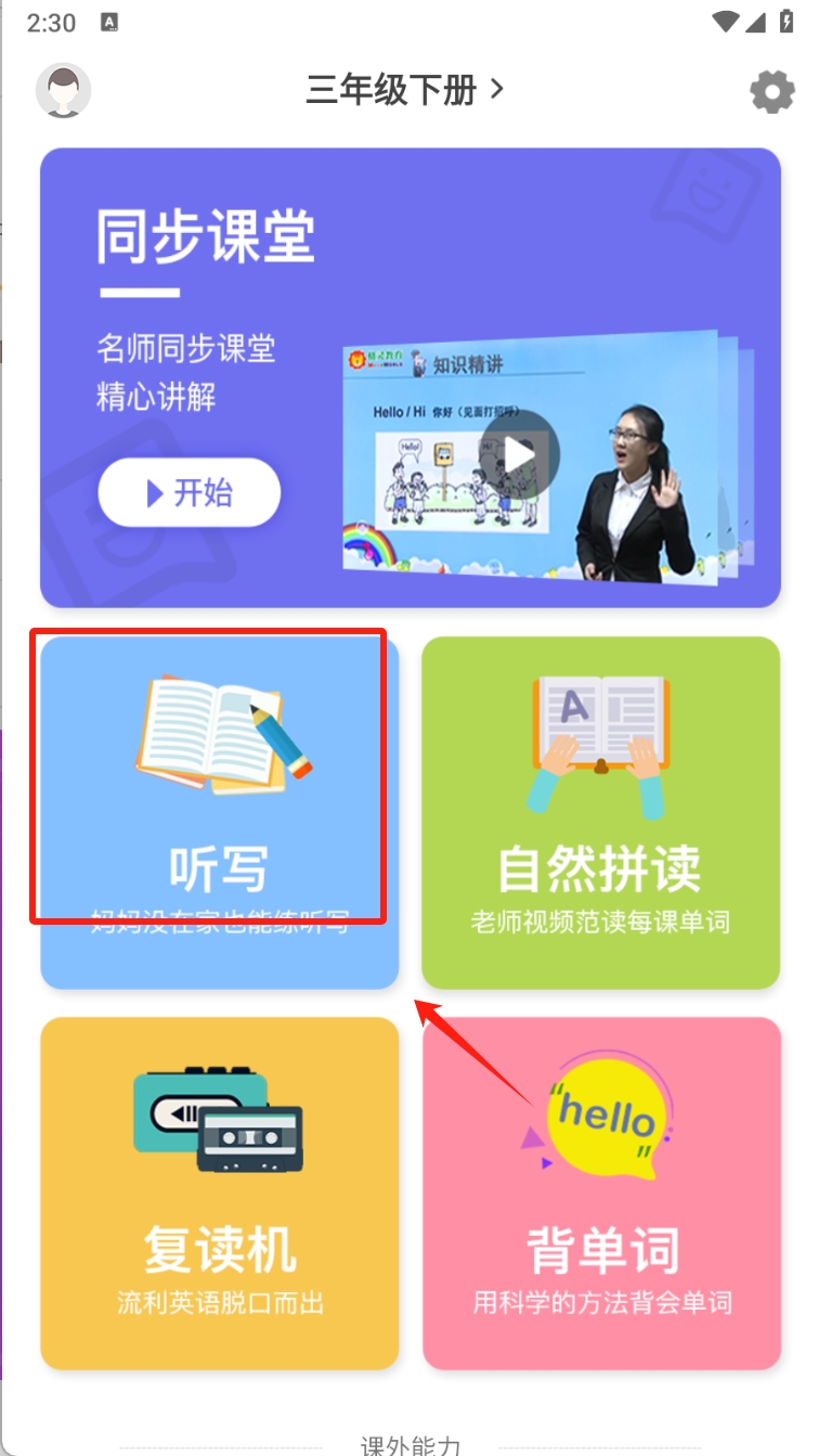 1、选择听写功能开始练习,在应用首页,点击“听写”图标,进入听写练习页面。
