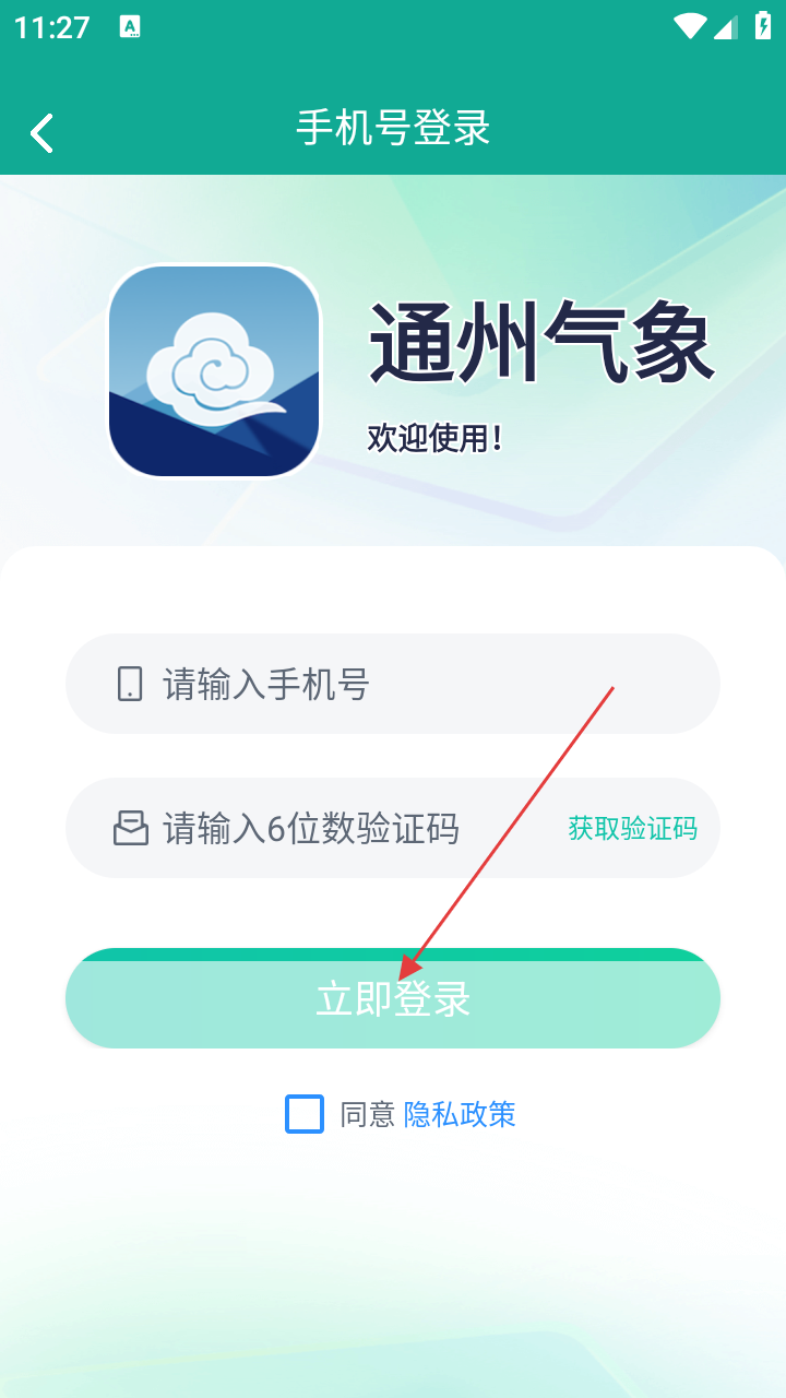 4、填完手机号与验证码,点击【立即登录】,完成“通州气象”APP登录。