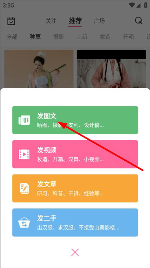 2、进入发布页面,用户可发布图文(晒图、摄影、种草、设计稿)、发布视频(妆造、开箱等)、发文章(研习、科普、经验等)、发二手闲置(出物、求物等)等,点击发布图文;