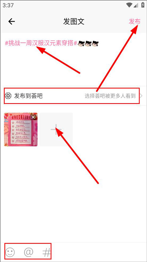 3、发布图文,选择需要发布的照片/视频,输入文案,下方可添加表情、话题,设置发布范围,点击发布即可发布动态。