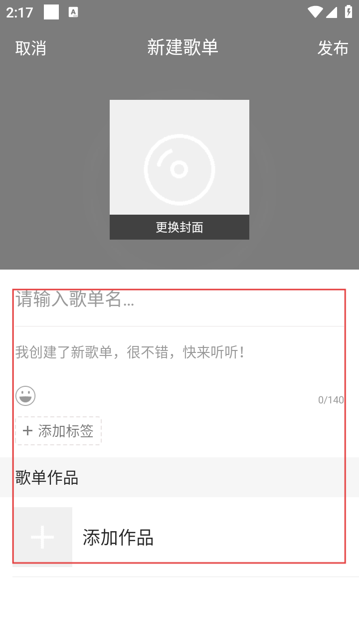 4、进入新建歌单页面,可输入歌单名、添加标签,还能点击【添加作品】来丰富歌单内容。