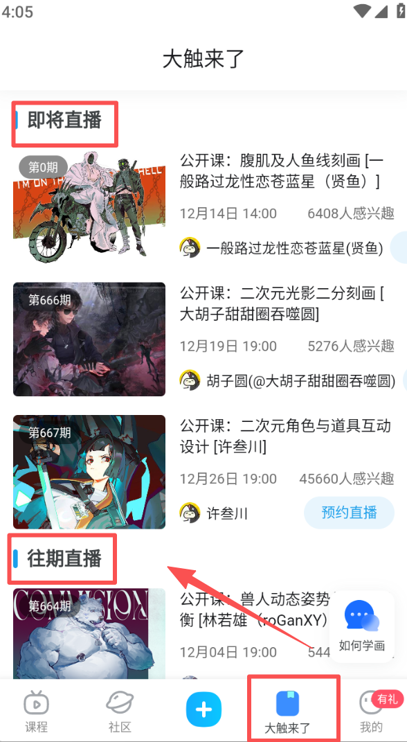 3、打开大触来了页面,在即将直播板块预约课程,也能在往期直播里回看已结束的绘画教学内容。