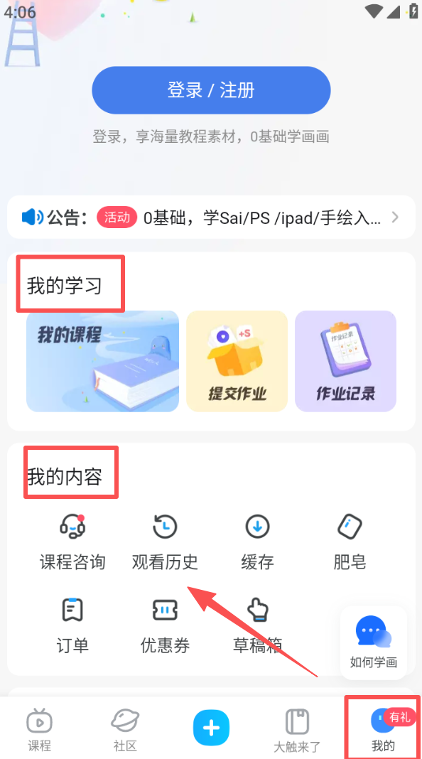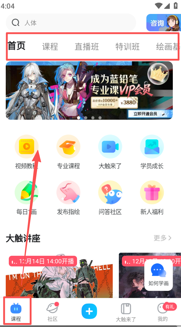 1、进入课程页面,在首页标签下选择课程、直播课等板块,获取绘画相关的学习资源。