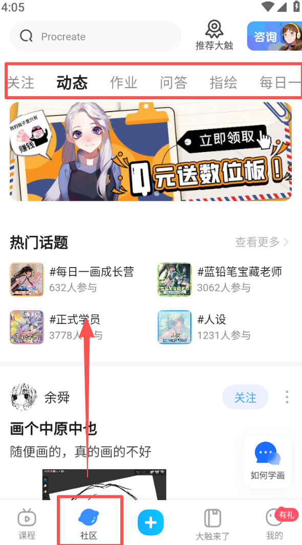 2、切换到社区页面,在动态、作业等标签下,参与热门话题,查看其他学员的创作内容与分享。