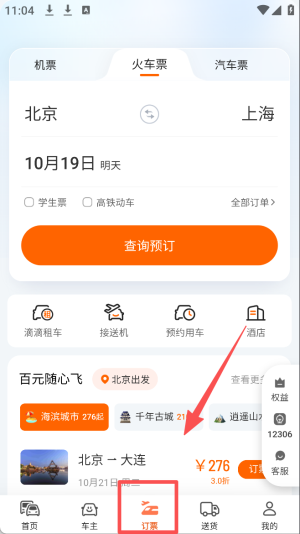 3、预订车票:在“火车票”页面选择出发地和目的地,查询并预订车票。