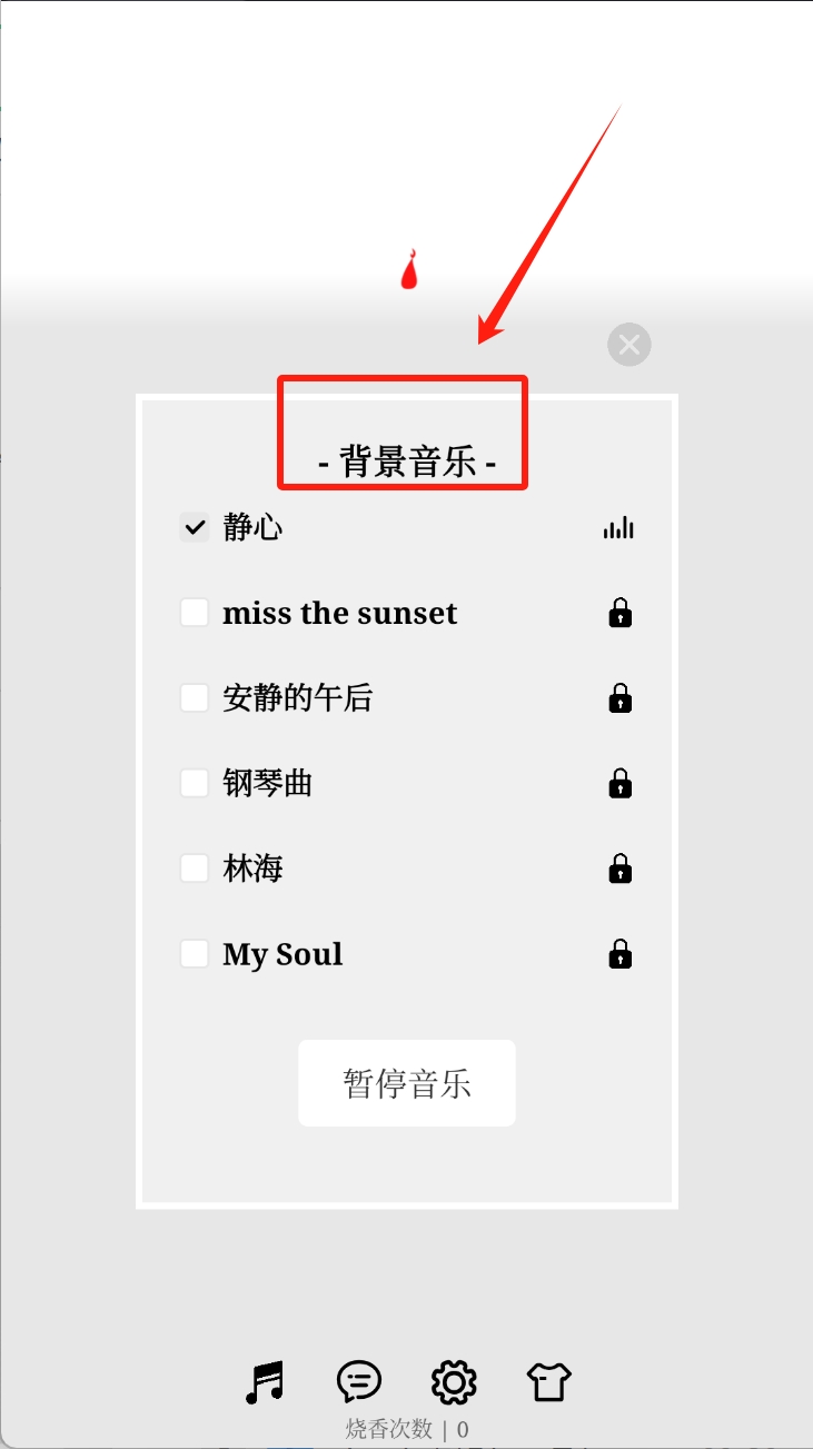 1、点击底部的音乐图标,选择一首背景音乐。这将为您的香薰体验添加氛围音乐。