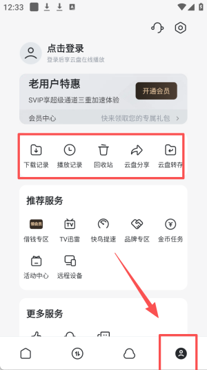 4、登录账户后,可以使用下载记录、云盘转存等功能。