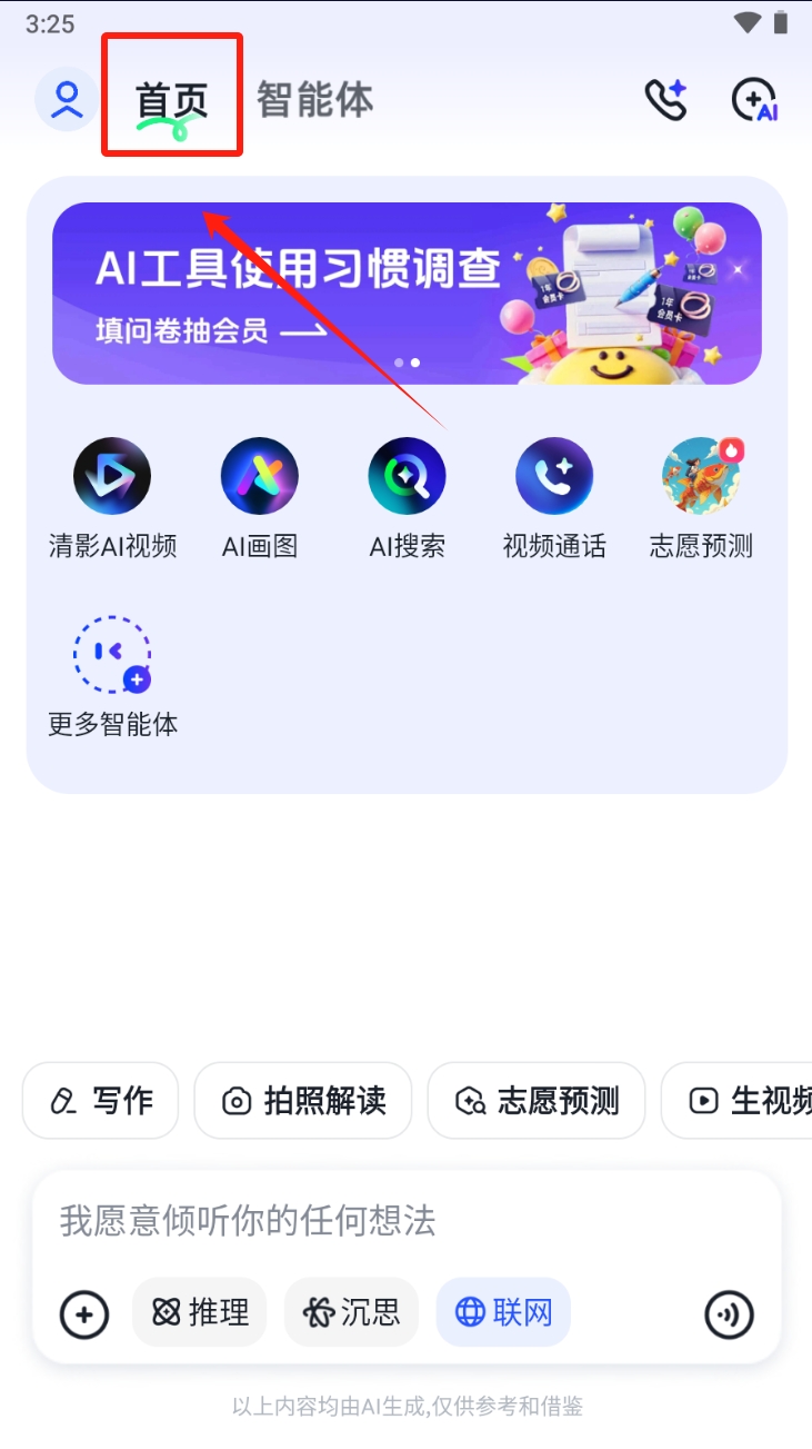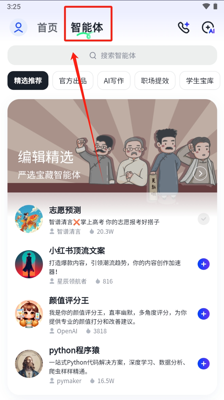 1、点击首页中的“智能体”选项,进入智能体功能页面,选择所需服务。