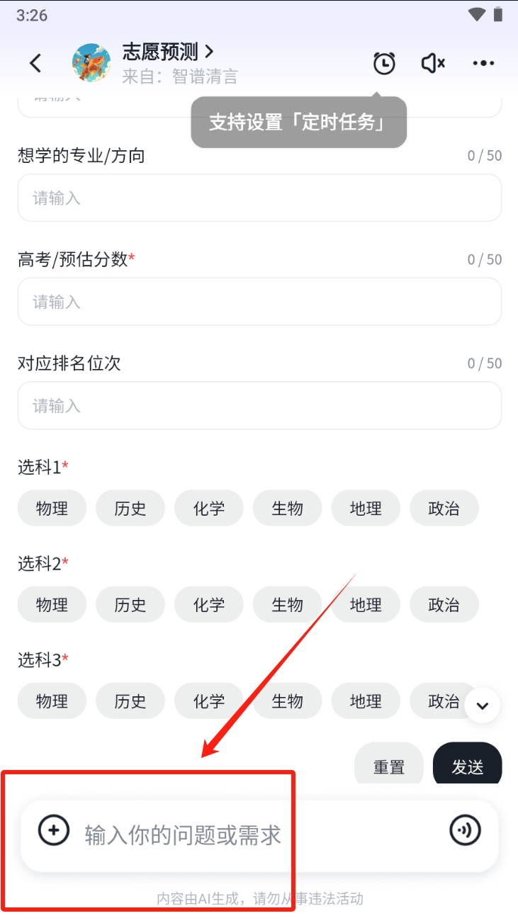3、在志愿预测页面,输入相关信息并选择科目,点击发送进行预测。