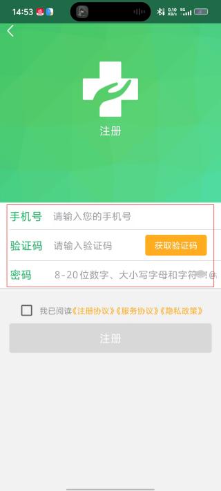 3、进入注册界面输入手机号、验证码以及密码后点击注册即可注册。
