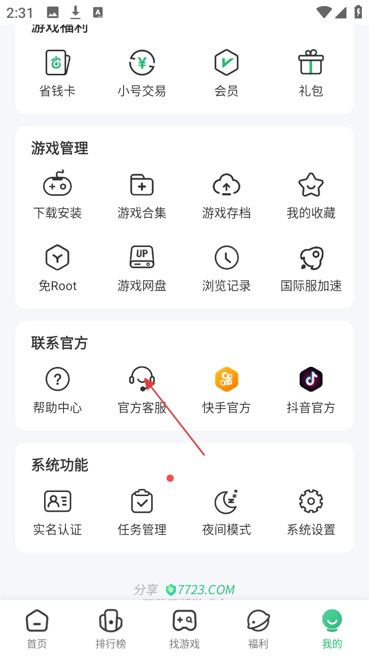 2、进入个人中心后,找到并点击【官方客服】选项,可进入客服中心页面。