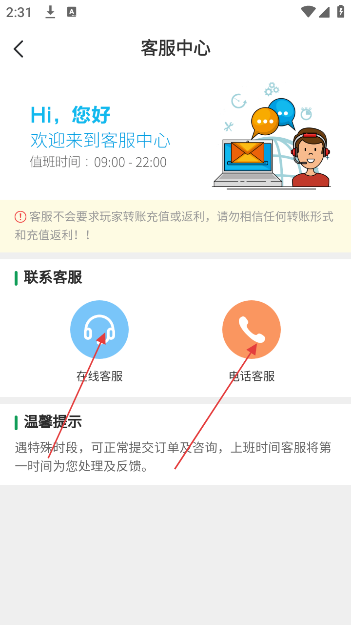 3、在客服中心页面,可根据需求选择【在线客服】或【电话客服】方式联系客服。