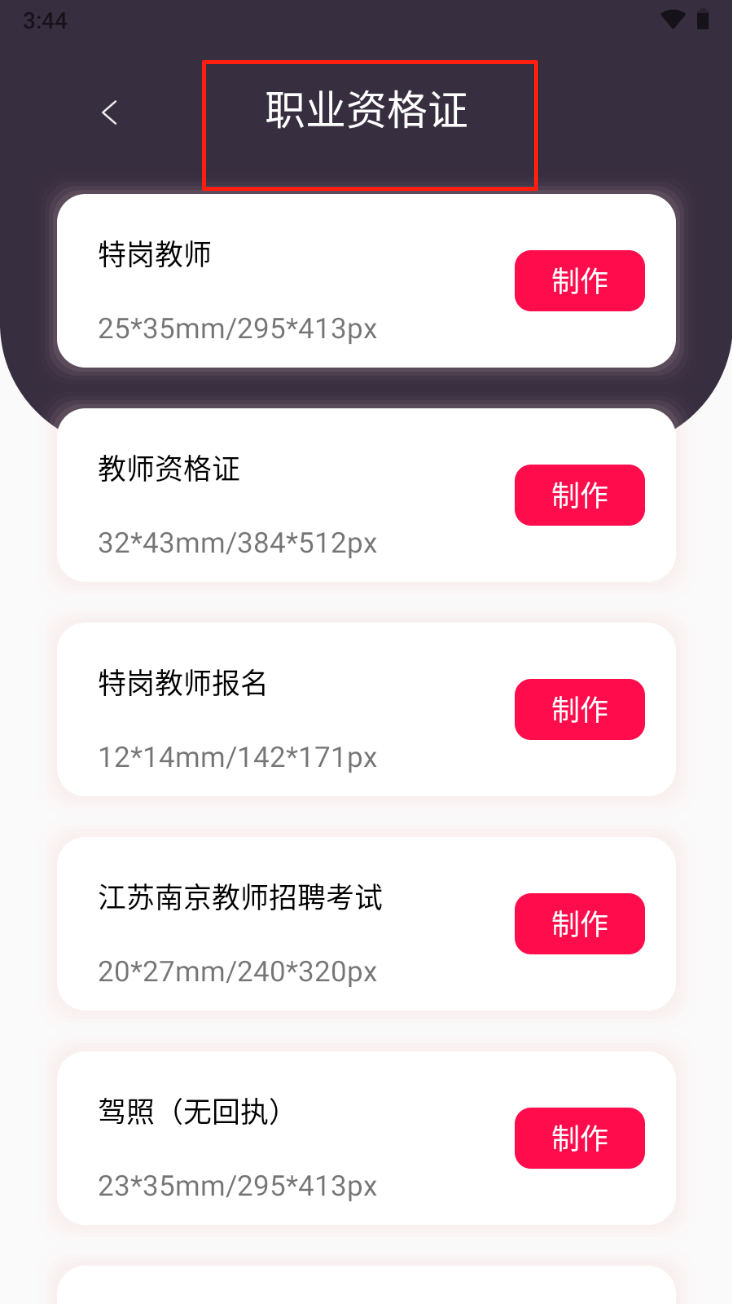 3、在“职业资格证”分类中选择相应证件类型,点击“制作”进行定制。
