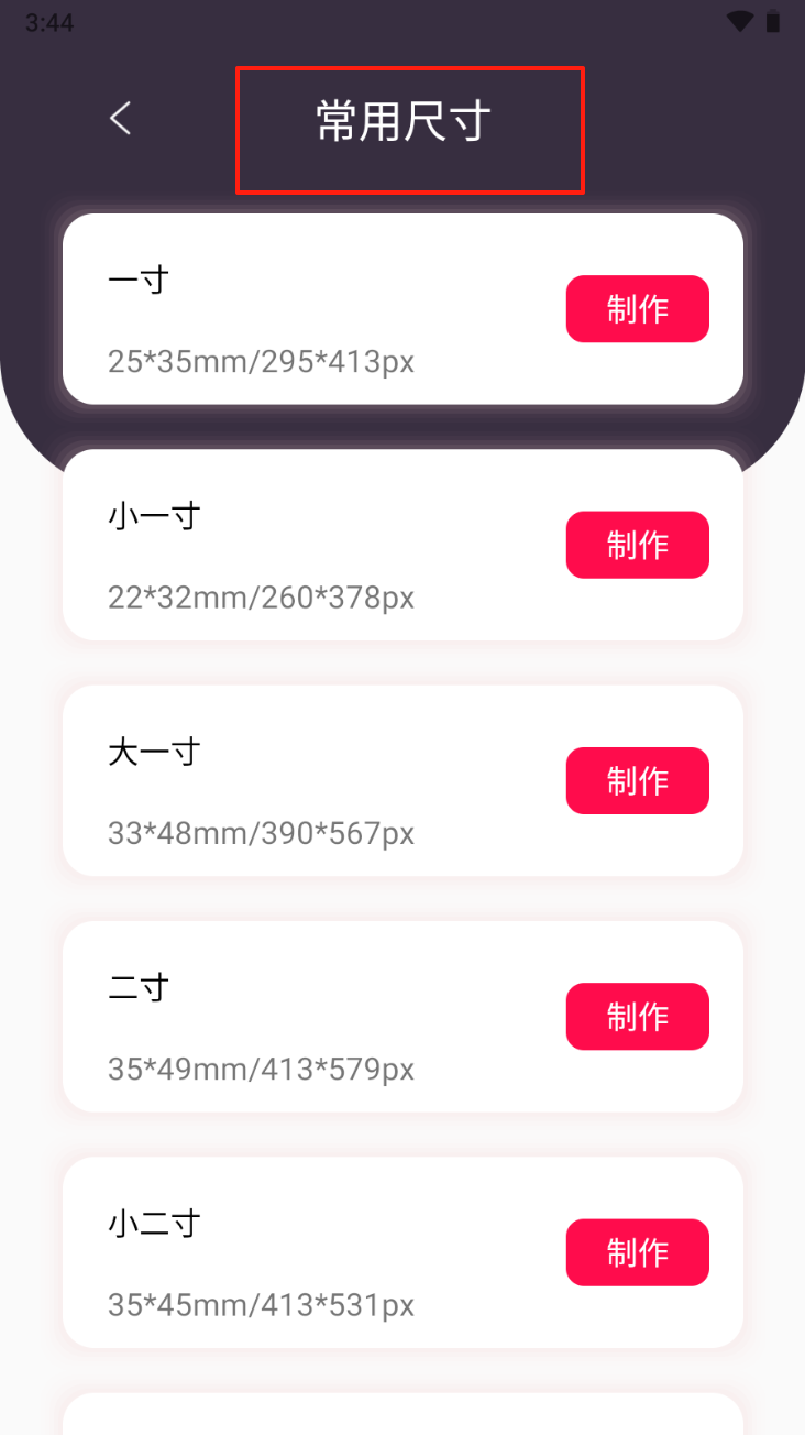 2、在“常用尺寸”页面选择所需尺寸,点击“制作”开始编辑。