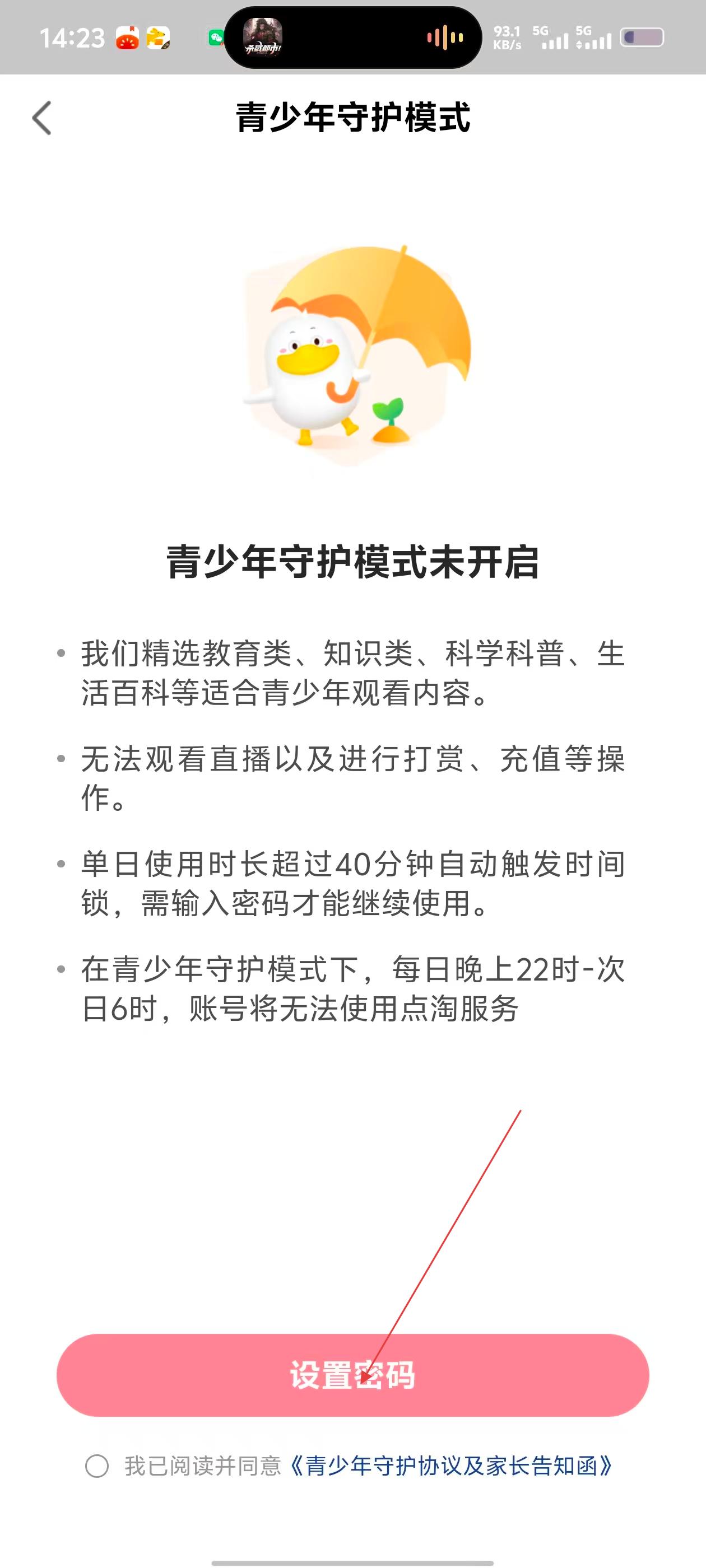 4、进入【青少年守护模式】页面,可查看该模式的相关规则,若要开启,勾选协议后设置密码即可。
