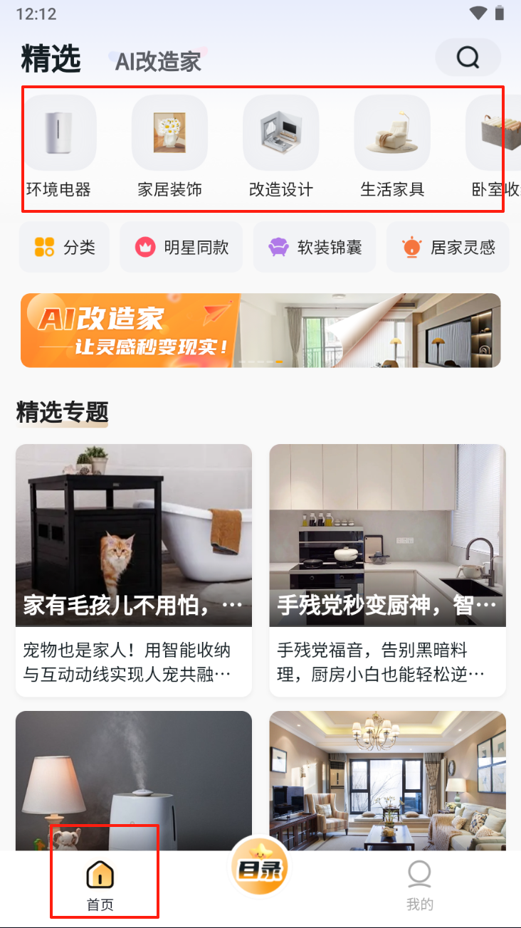 2、浏览精选内容。点击首页的“精选”标签,查看推荐的家居装饰和生活家具。