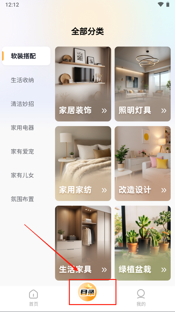 3、查看全部分类。点击“目录”按钮,浏览所有分类,如家居装饰、照明灯具等。