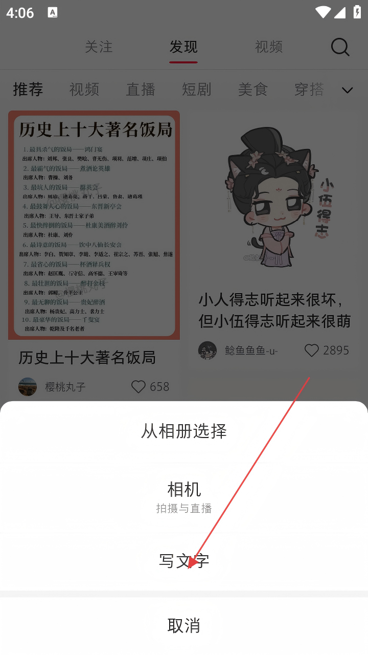 2、在弹出选项中,选择【写文字】,进入文字创作页面。