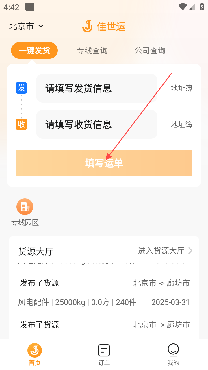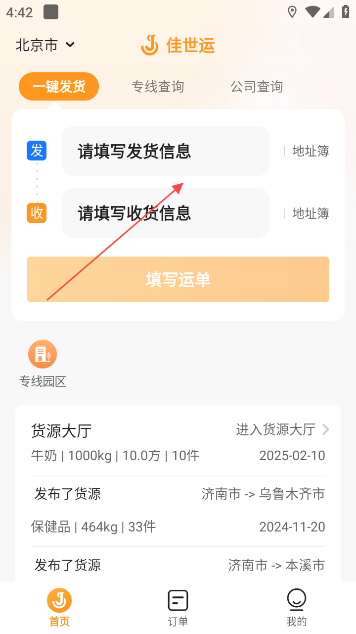 3、回到首页,填写【发货信息】【收货信息】,点击【填写运单】。