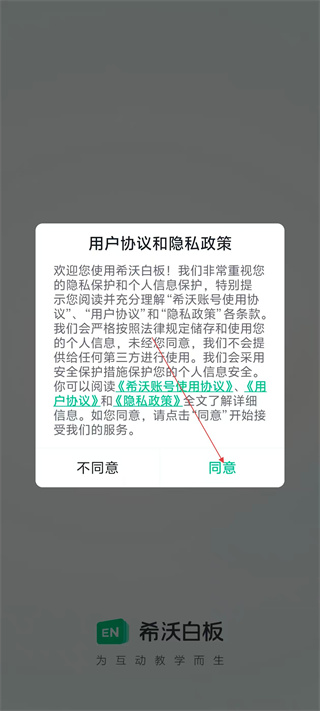 1、使用【希沃白板】前,需阅读并同意【用户协议】和【隐私政策】,点击“同意”方可继续使用服务。