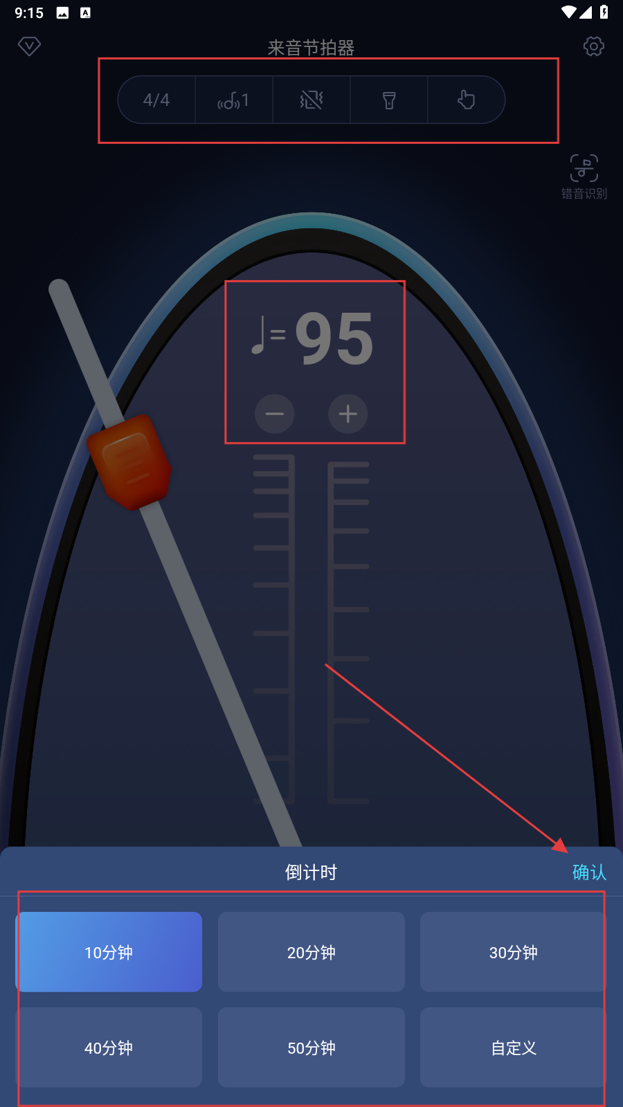 1、打开应用,在节拍器页设置节拍、倒计时,点击【确认】,进入参数设置环节。